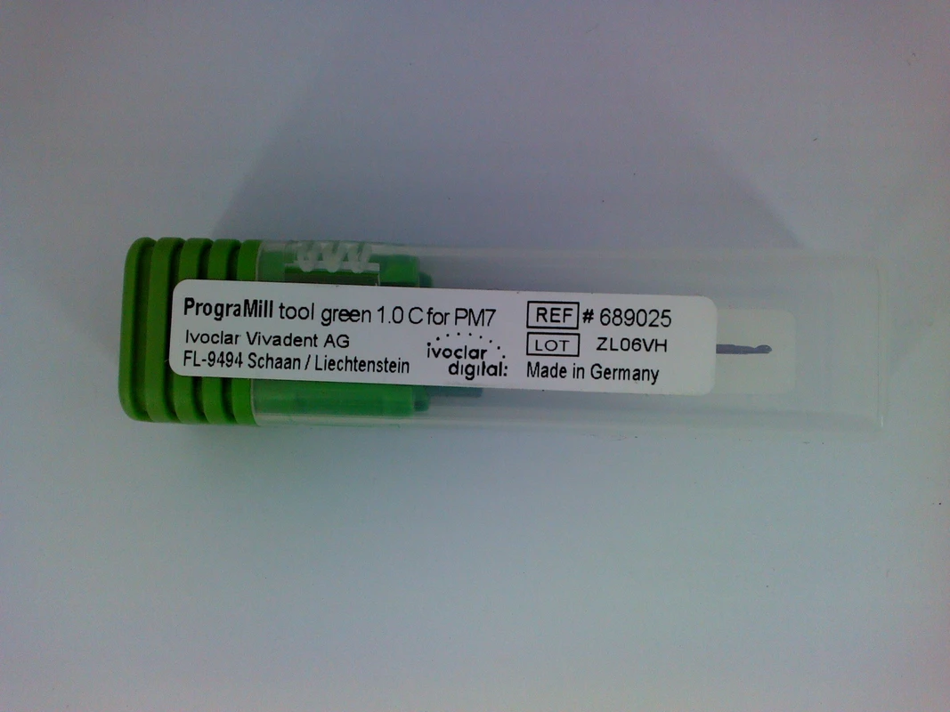 Eine breite Palette an PrograMill-Werkzeugen bietet Anwendern vielfältige Verarbeitungsmöglichkeiten. Neben Werkzeugen für die Bearbeitung von Zirkoniumoxid, PMMA und Wachs stehen zusätzlich speziell entwickelte Werkzeuge zum Beispiel für IPS e.max® CAD for PrograMill zur Verfügung. Darüber hinaus umfasst das Sortiment auch hochwertige einschneidige Werkzeuge für die optimierte Kunststoffbearbeitung. PrograMill Tools wurden speziell für die unterschiedlichen CAD/CAM-Materialien entwickelt und anhand eines Rings am Schaft mit einer Farbcodierung versehen. Jede Farbe steht für ein anderes Material. Die Materialien selbst sind entsprechend farbig markiert. Im User-Interface der PrograMill-Maschinen führt sich die Farbcodierung fort. Die Handhabung der Werkzeuge ist dadurch intuitiv und einfach. PrograMill tool yellow 1.0c for PM7 c = coated (Beschichtung für höhere Standzeiten und ausdauernde Produktion) PrograMill tool green f1.5 for PM7 f = flat (Sondergeometrie: Bei diesem Werkzeug handelt es sich um einen Flachfräser) PrograMill tool red g2.0 for PM7 g = grinder (Sondergeometrie: Diamantbeschichtete Schleifer für die Nassbearbeitung von Glaskeramik) Farbcodierung: yellow = für Zirkoniumoxid, red = für Glaskeramik, blue = für Kobalt-Chrom/Titan, green = für PMMA/DCL, black = für Wachs Inhalt Werkzeug