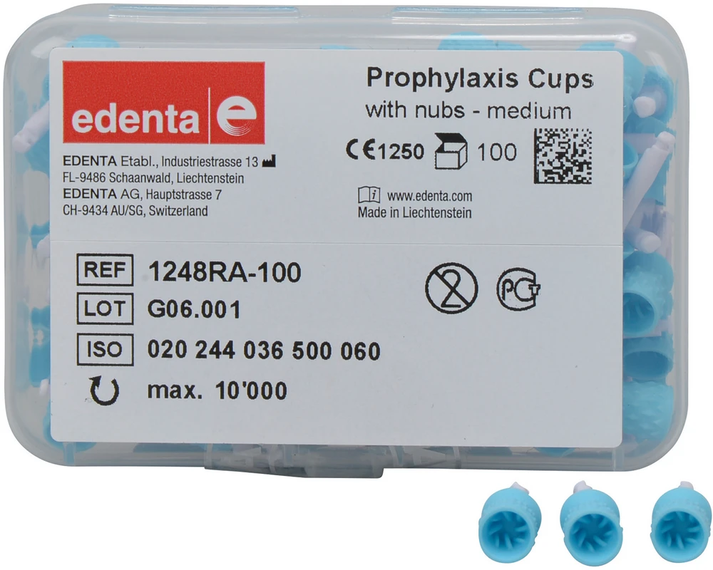Produktinformationen "Prophylaxis Cups with nubs Packung 100 Stück blau medium, RA, Figur 036 mit Noppen, 9 mm, ISO 060"