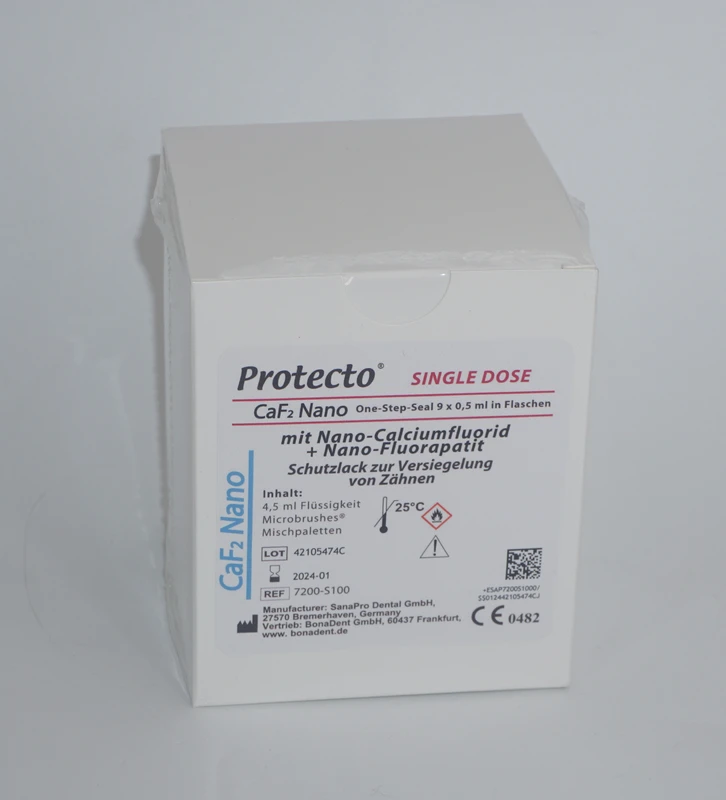 Protecto CaF2 Nano ist ein patentiertes silikongruppenhaltiges Co-Polymer mit nicht sauren Haftgruppen zur Versiegelung von glatten Zahnflächen. Der Einkomponenten-Schutzlack eignet sich besonders