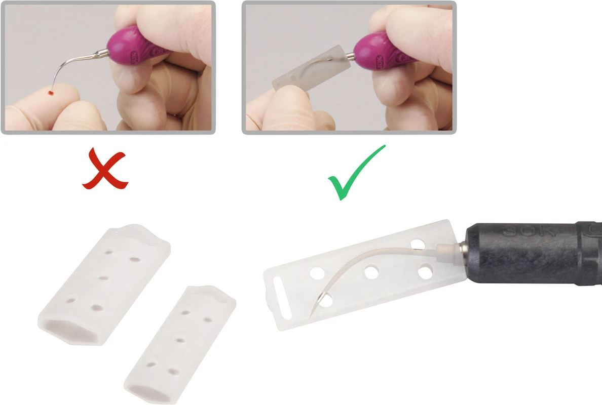 Die Protecto-Tips lassen sich schnell und sicher auf Instrumentenspitzen aufstecken. Ideal zur sicheren Sterilisation empfindlicher Instrumente. Auch für Cavitron Inserts empfohlen.