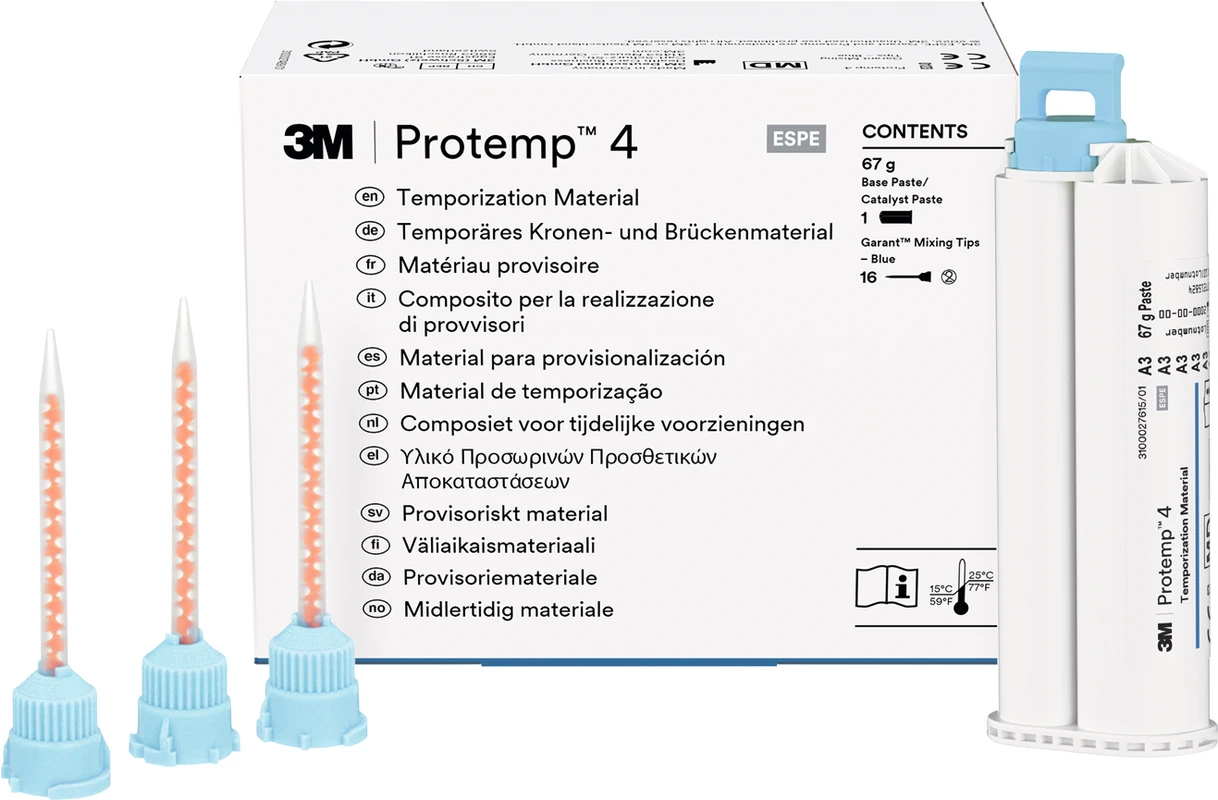 3M™ Protemp™ 4 Temporäres Kronen- und Brückenmaterial bietet eine zuverlässige und starke temporäre Versorgung mit rekordverdächtiger Festigkeit, besserer Abrasionsstabilität und ist auch für Langzeitprovisorien geeignet. Sehr hohe Festigkeitswerte Hervorragende Ästhetik Einfache, zeitsparende Handhabung Zum automatischen Anmischen und Dosieren im 3M™ Garant™ Dispenser Herstellung von temporären Kronen und Brücken, Inlays, Onlays, Veneers und Langzeitprovisorien Versorgung von Implantat-Abutments Als Unterfütterungsmaterial für vorgefertigte Kronen aus Komposit (z. B. 3M™ Protemp™ Crown Temporäre Kronen) und Metall (z. B. 3M™ Iso-Form™ Temporäre Kronen) verwendbar Veneers Langzeitprovisorien Versorgung von Implantat Abutments Inhalt 50 ml Kartusche16 Mischkanülen