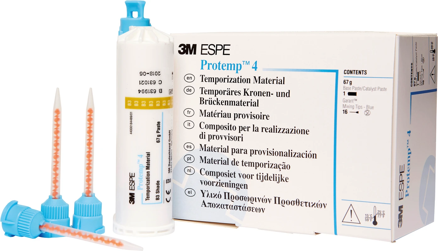3M™ Protemp™ 4 Temporäres Kronen- und Brückenmaterial bietet eine zuverlässige und starke temporäre Versorgung mit rekordverdächtiger Festigkeit, besserer Abrasionsstabilität und ist auch für Langzeitprovisorien geeignet. Sehr hohe Festigkeitswerte Hervorragende Ästhetik Einfache, zeitsparende Handhabung Zum automatischen Anmischen und Dosieren im 3M™ Garant™ Dispenser Herstellung von temporären Kronen und Brücken, Inlays, Onlays, Veneers und Langzeitprovisorien Versorgung von Implantat-Abutments Als Unterfütterungsmaterial für vorgefertigte Kronen aus Komposit (z. B. 3M™ Protemp™ Crown Temporäre Kronen) und Metall (z. B. 3M™ Iso-Form™ Temporäre Kronen) verwendbar Veneers Langzeitprovisorien Versorgung von Implantat Abutments Inhalt 50 ml Kartusche16 Mischkanülen