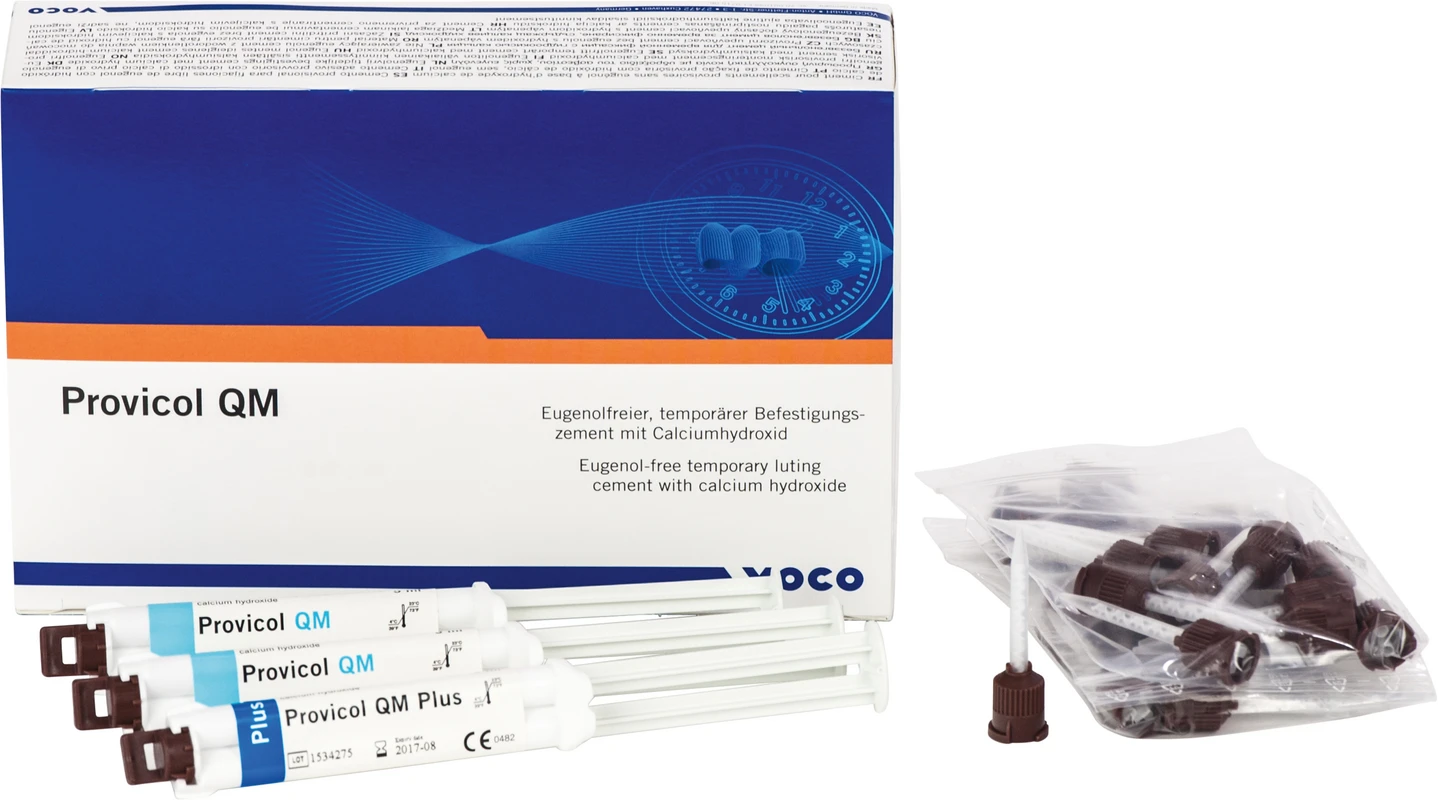 Temporärer Befestigungszement mit noch besserer Haftung. Alle Vorteile des bewährten Provicol QM, aber jetzt mit noch höherer Haftung: Der neue temporäre Befestigungszement Provicol QM Plus eignet sich dank seiner höheren Festigkeit optimal für den Einsatz in klinischen Situationen, in denen besonders starker Halt gefordert ist. Provicol QM Plus ist wie alle Produkte aus der Provicol-Familie eugenolfrei und hat somit keinen Einfluss auf die Aushärtung und die Eigenschaften von Composite-Materialien, die eventuell im Anschluss zur definitiven Befestigung genutzt werden. Ebenso enthält Provicol QM Plus Calciumhydroxid, welches die Bildung von Sekundärdentin fördert und bakteriostatisch wirkt, sowie Zinkoxid, das für seine antibakterielle Wirkung bekannt ist.