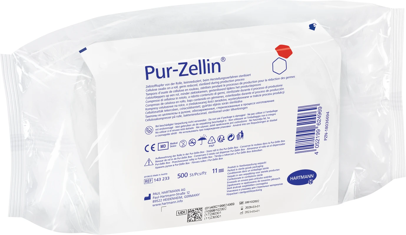 Tupfer aus hochgebleichtem Verbandzellstoff, gebrauchsfertig vorgestanzt auf der Rolle. Formstabil, abriebfest, steril und unsteril erhältlich.