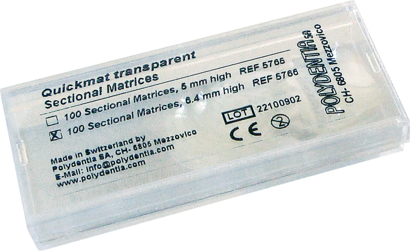 Quickmat DELUXE ist ein neues Teilmatrizensystem, das präzise sowie anatomische korrekte Kontaktpunkte bei Klasse-II-Restaurationen ermöglicht. Die Edelstahl-Teilmatrizen sind jeweils in sehr dünnen (0,025 mm), dünnen (0,04 mm) sowie in Prämolar und Molar verfügbar. Zur Ergänzung beinhaltet Quickmat DELUXE eine große Auswahl an Holzkeilchen in verschiedenen Größen sowie autoklavierbare Quickringe. Die Packung ist reichlich bestückt und bietet somit ein ausserordentlich optimales Qualität/Inhalt/Preis-Verhältnis! Die Quickmat Deluxe-Zange wurde zur optimalen Positionnierung der Quickringe adaptiert, autoklavierbar. Die Quickmatrix-Zange dient einer einfachen Handhabung der Teilmatrizen, autoklavierbar.