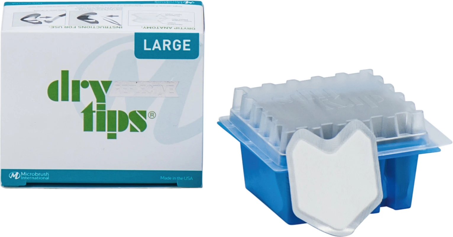 Original Reflective DryTips® Parotispflaster/Speichelabsorber mit reflektierender Oberfläche für bessere Sichtverhältnisse im Arbeitsfeld. Vollständige Abdeckung des Ohrspeicheldrüsen-Kanals. Nimmt Flüssigkeit direkt dort auf, wo sie entsteht. Ideal für: