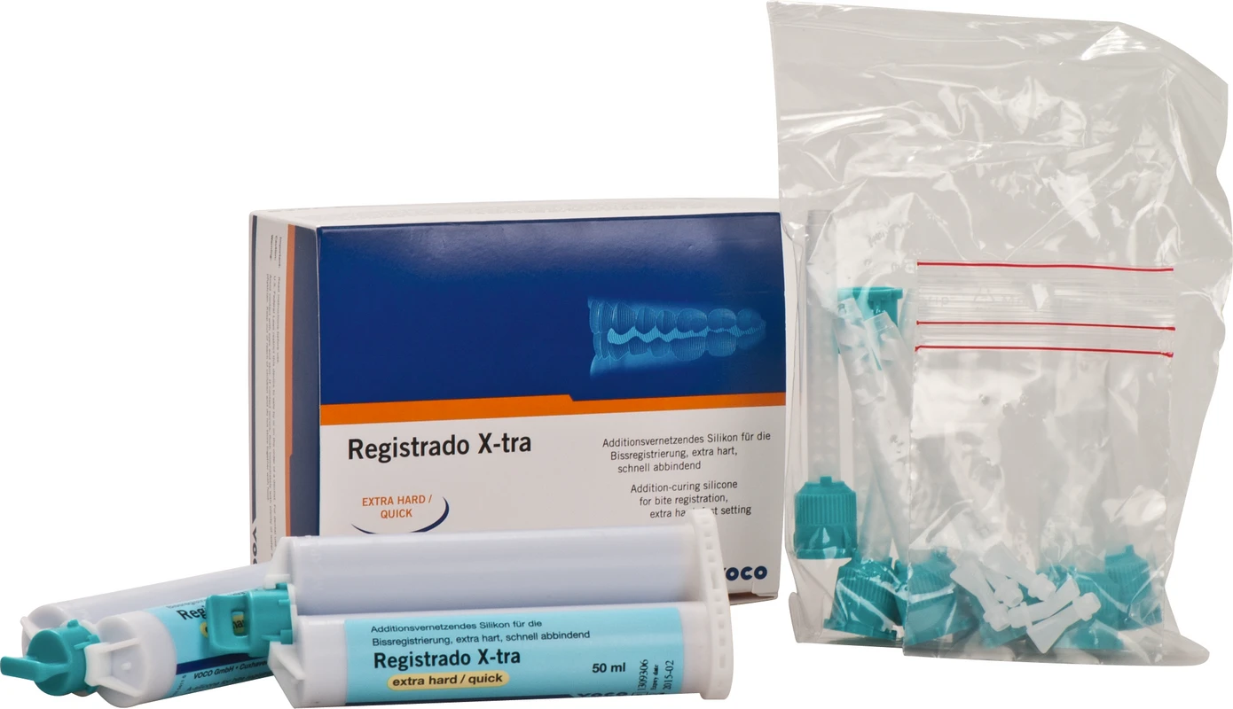 Extra hartes, schnell abbindendes, additionsvernetzendes Silikon zur Bissregistrierung im Kartuschensystem. Besonders vorteilhaft ist auch die temperaturgesteuerte Abbindezeit von Registrado X-tra, die Mundverweildauer beträgt nur 40 Sekunden.