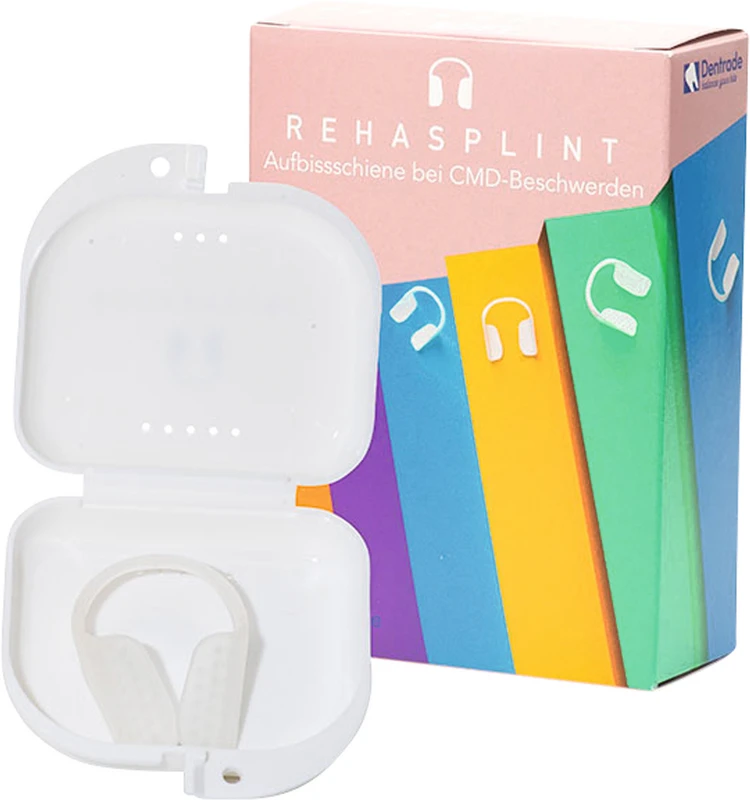 Die RehaSplint Schiene wird ohne vorherige Anpassung getragen und eignet sich als temporäre Entspannungsschiene, z. B. zur Überbrückung bis zur endgültigen CMD-Therapie oder Versorgung. Sie kann helfen, Muskelverspannungen zu reduzieren und Beschwerden im Kieferbereich vorübergehend zu lindern.
