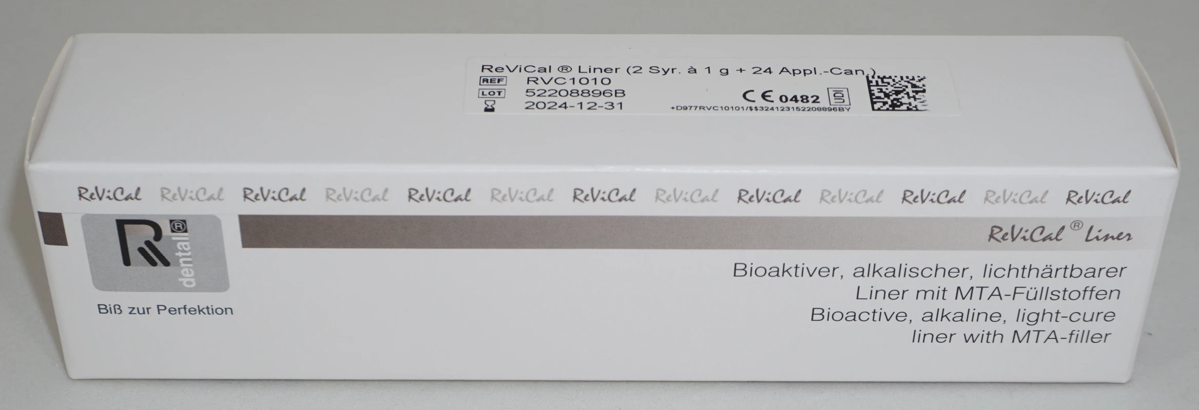 Bioaktives, lichthärtbares Unterfüllungsmaterial mit MTA-Füllstoffen. ReViCal® Liner ist durch eine bedeutend hohe Druck- und Biegebruchfestigkeit für allgemeine und sichere Unterfüllungen und indirekte Pulkpenüberkappung (Cp) indiziert.