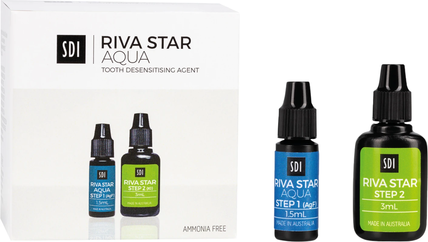 SDI hat sein SDF-System weiterentwickelt, und zwar zu RIVA STAR AQUA, einer wasserbasierten Silberfluorid-Lösung der neuesten Generation, die wie SDF kariöse Läsionen wirksam arretiert und den Patienten weitere Vorteile bietet. Ähnlich wie Riva Star (SDF) ist RIVA STAR AQUA (AgF) ein patentiertes, nicht- invasives 2-Schritt-System zur Desensibilisierung von Zähnen mit wenigen Tropfen. RIVA STAR AQUA ist eine wässrige Silberfluorid-Lösung ohne Ammoniak.