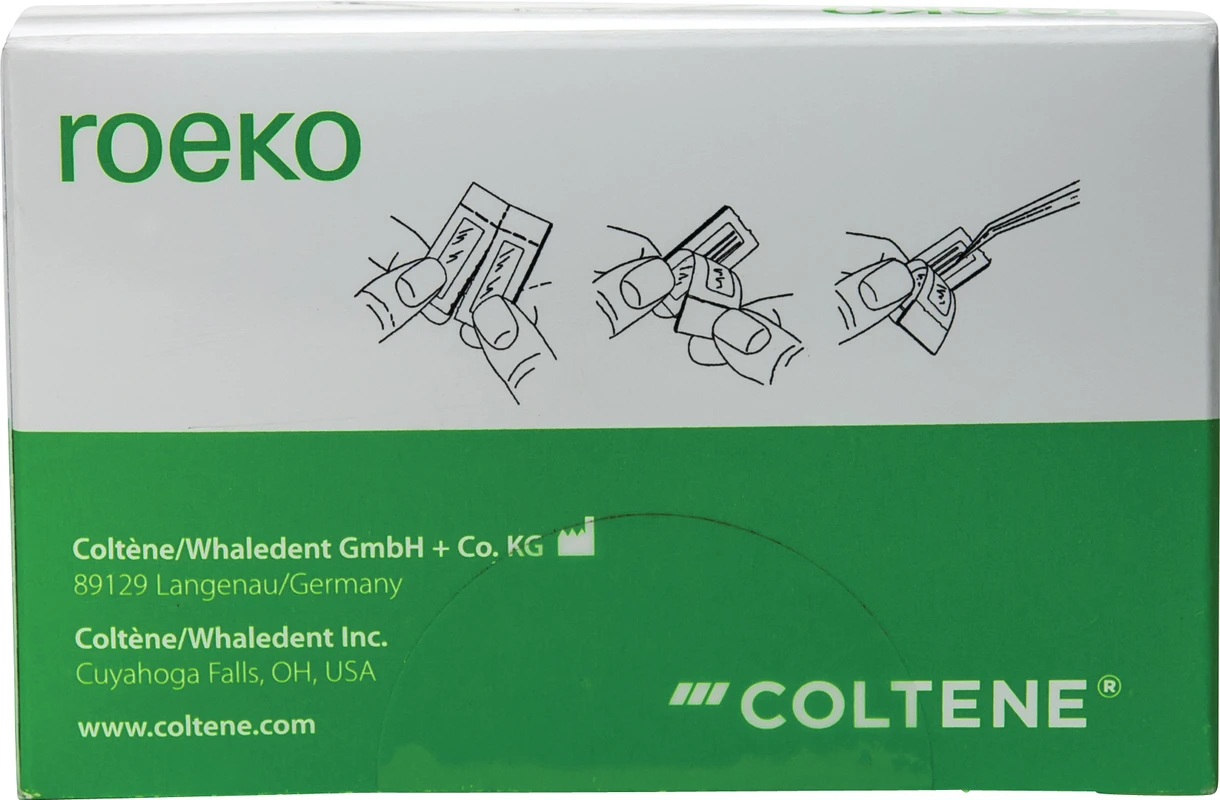 roeko Top color Papier-Spitzen verbinden die Vorteile der weissen und der ganz eingefärbten Spitzen (color). Die Teilfarbkodierung verhindert die Verwechslung von verschiedenen Größen. Die weiße Spitze erleichtert die Kontrolle der Wurzelkanalreinigung.