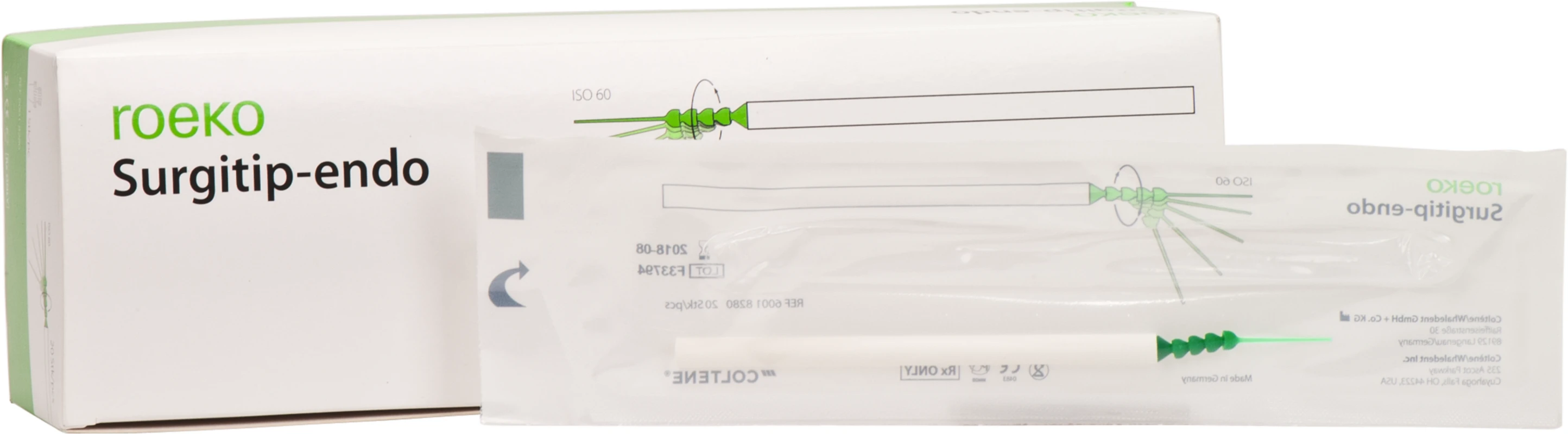 Surgitip-endo saugt im Wurzelkanal Spüllösungen und Feuchtigkeit schnell und gründlich auf. Der Zeitaufwand zur finalen Trocknung des Kanals wird deutlich verringert. Ebenso die Anzahl der benötigten Papierspitzen. Lediglich zur abschliessenden Trocknungskontrolle wird die Verwendung von Papierspitzen empfohlen.