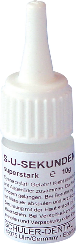 Der S-U-SEKUNDENKLEBER ist zum schnellen Verkleben von Kunststoff, Metall und Gips geeignet. Dank seiner Dünnflüssigkeit ist er gut zum Versiegeln von Gipsoberflächen zu verwenden, wodurch äußerste Härte und Kantenfestigkeit erzielt werden. Zudem werden angezeichnete Präparationsgrenzen dauerhaft sichtbar.