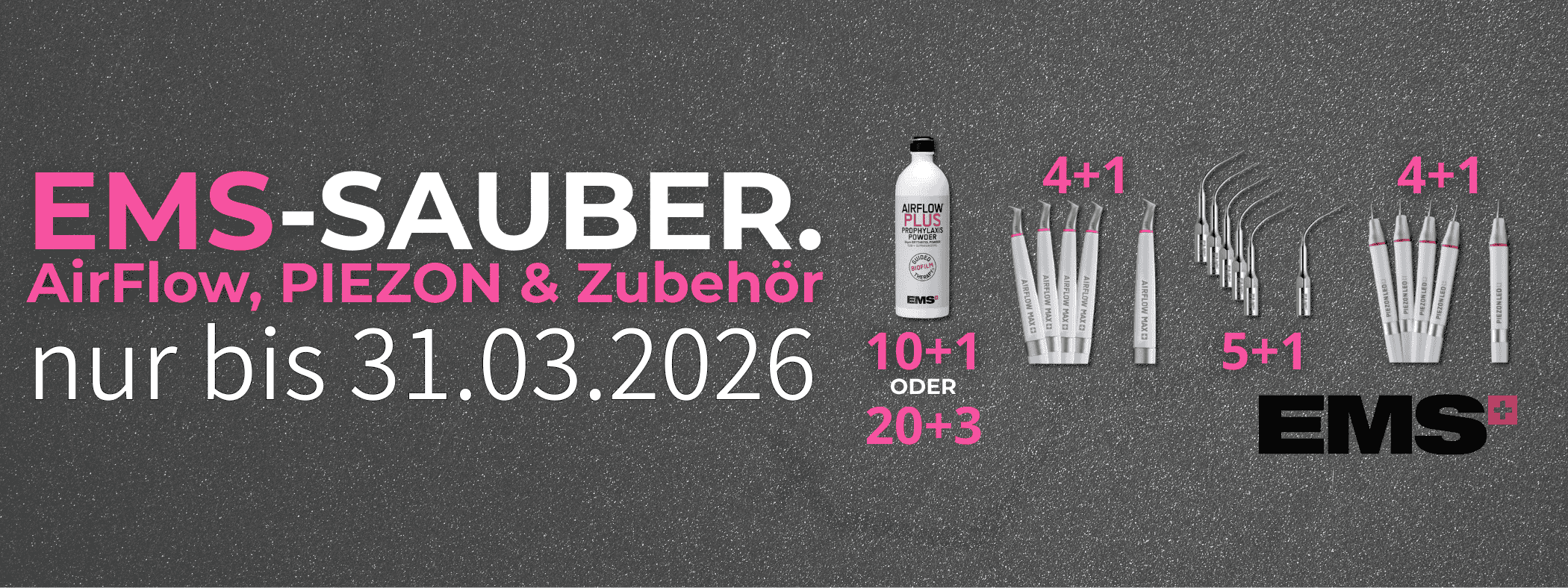 Die Produkte von EMS sind fester Bestandteil moderner Prophylaxekonzepte und werden international in Zahnarztpraxen und Kliniken eingesetzt. Der Fokus liegt dabei klar auf Qualität, technischer Präzision und praxisnaher Anwendung. Bei dentalkiosk.de findest du eine sorgfältig zusammengestellte Auswahl an EMS Produkten – von Handstücken über Pulver bis hin zu passendem Zubehör. Direkt verfügbar, klar strukturiert und auf den professionellen Praxisalltag ausgelegt.