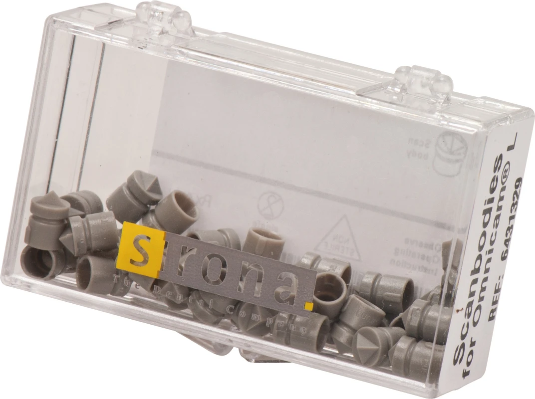 ScanPost und TiBase können zur optischen Erfassung der Implantatlage nur mit geeigneten Scanbodies verwendet werden. Dabei ist zwischen verschiedenen Aufnahmesystemen und Anschlussgeometrien zu unterscheiden. Scanbodies for Bluecam sind weiß und für folgende Aufnahmesysteme geeignet: inEos X5, inEos Blue und CEREC AC mit Bluecam. Scanbodies for Omnicam sind grau und ausschließlich zur Anwendung von CEREC AC mit Omnicam geeignet. Scanbodies sind in den Anschlussgrößen S und L erhältlich. Alle Scanbodies sind desinfizierbar und nur zum einmaligen Gebrauch bestimmt.