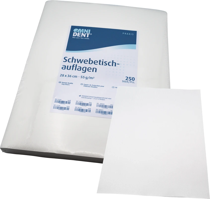 Die Schwebetischauflagen dienen als hygienische Einwegunterlage. Sie nehmen Feuchtigkeit zuverlässig auf und schützen Arbeitsflächen vor direkten Materialkontakten – ideal für den Arbeitsalltag in der Zahnarztpraxis.