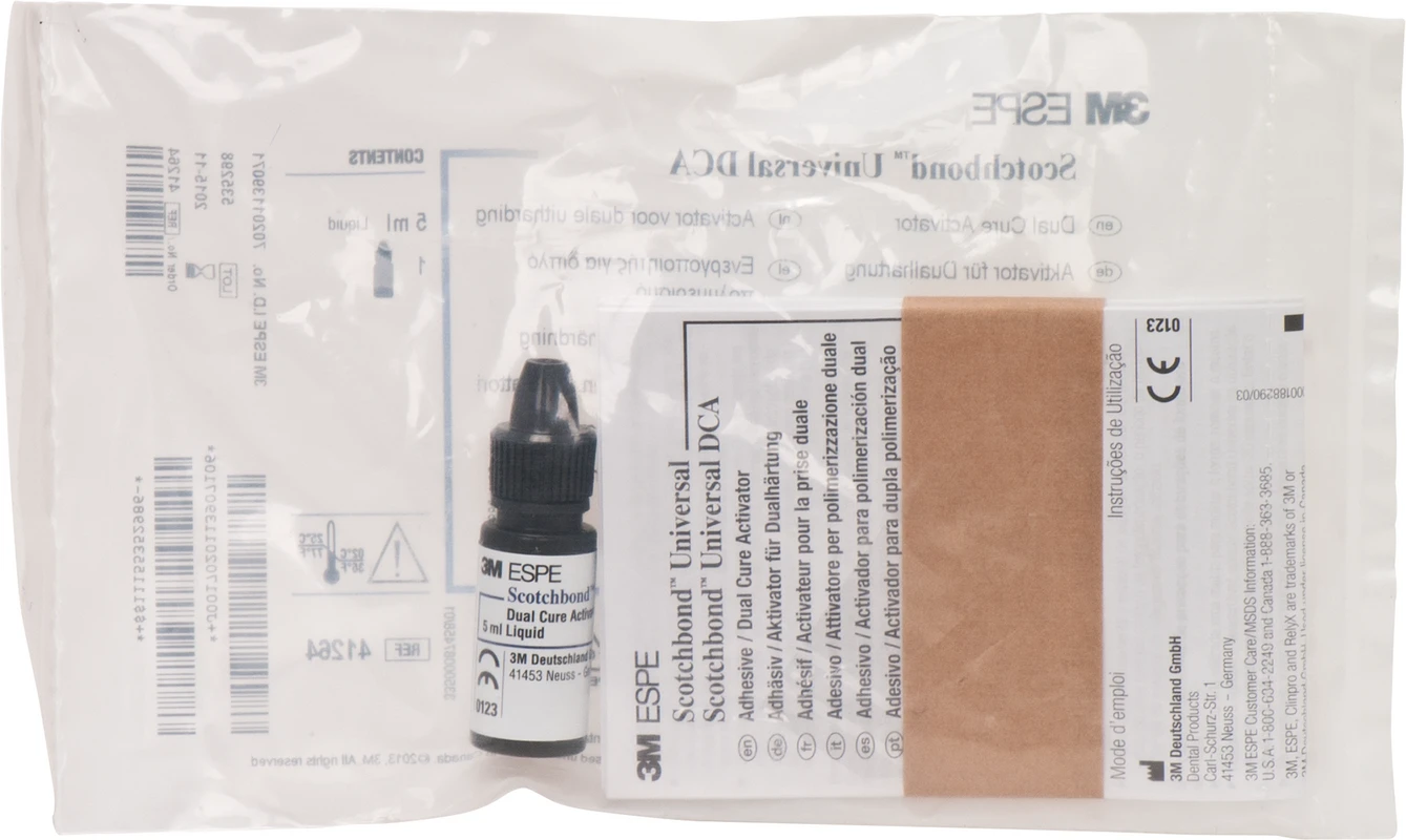 - In Verbindung mit 3M™ Scotchbond™ Universal Adhäsiv dient der Aktivator (DCA) als Co-Initiator in dual- und selbsthärtenden Befestigungssystemen sowie Stumpfaufbaumaterialien bei Abwesenheit von Licht