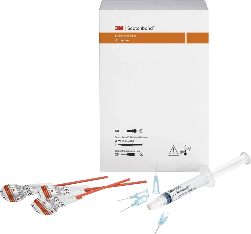 3M™ Scotchbond™ Universal Plus Adhäsiv ist für alle direkten und indirekten Indikationen und alle Ätztechniken geeignet. Es haftet an allen Restaurationsmaterialien ohne zusätzlichen Primer. Seine einzigartigen „Plus“ Eigenschaften: dentinähnliche Röntgenopazität, hervorragende Haftung, BPA-freie Formulierung, kompatibel mit allen dual- und selbsthärtenden Kompositen ohne Dualhärtungsaktivator.
