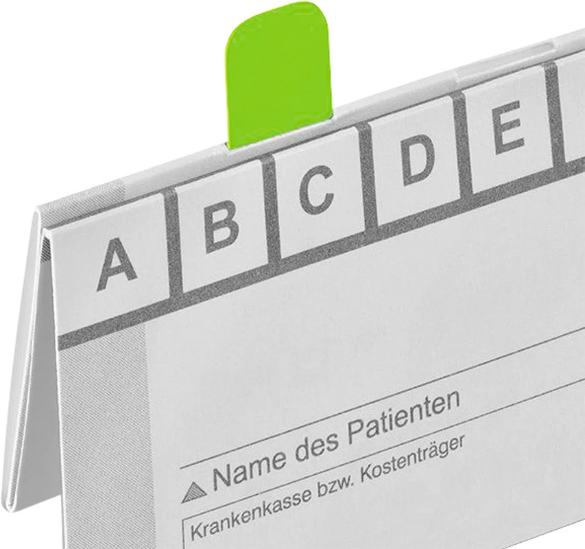 Diese praktischen Signalaufstecker erleichtern die strukturierte Organisation Ihrer Patientenkartei. Die Karteireiter werden einfach in die A4- oder A5-Karteikarten von Beycodent eingeklickt und bieten eine sofort sichtbare Markierung – etwa für Krankenkassen, Altersgruppen oder individuelle Merkmale.