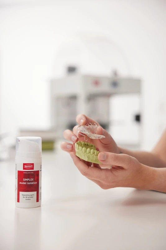 SIMPLEX model isolation ist als Modellisolierung auf 3D-gedruckte Filament-Modelle abgestimmt. Mit der gebrauchsfertigen Isolierung lassen sich auf dem gedruckten Modell unkompliziert KFOApparaturen aus Dentalkunststoff fertigen. Aufgetragen mit einem Pinsel, entsteht auf der Modelloberfläche ein gleichmäßiger, hauchfeiner Isolierfilm. Ergebnis ist die saubere Trennung von Modell- und Dentalkunststoff. Das Arbeitsstück lässt sich nach der Polymerisation mit präziser, zeichnungsgenauer Oberfläche vom Modell abheben. Vorteile