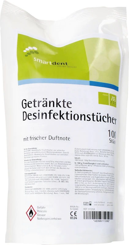 Die smart Desinfektionstücher eignen sich optimal für die prophylaktische Desinfektion von Hand- und Winkelstücken, Behandlungseinheiten sowie Arbeitsflächen in der Zahnarztpraxis. Die Einwirkzeit beträgt je nach Erregerprofil 1–2 Minuten. Bitte nur auf alkoholbeständigen Materialien anwenden.