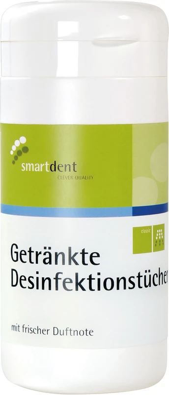Die smart Desinfektionstücher eignen sich optimal für die prophylaktische Desinfektion von Hand- und Winkelstücken, Behandlungseinheiten sowie Arbeitsflächen in der Zahnarztpraxis. Die Einwirkzeit beträgt je nach Erregerprofil 1–2 Minuten. Bitte nur auf alkoholbeständigen Materialien anwenden.
