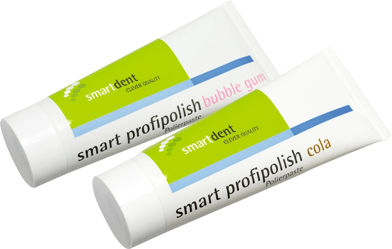 smart profipolish ist eine Prophylaxepaste für die Endpolitur natürlicher Zähne und Füllungen. Smart profipolish hat einen Natriumfluoridanteil von 0,2 %, ist gluten-, laktose- und phthalatfrei, RDA 40, Farbe gelb.