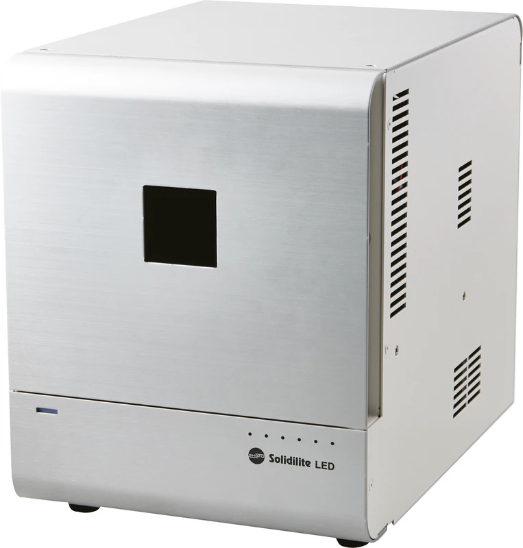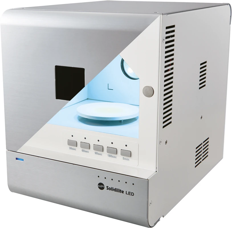 Leistungsstarke LED-Power mit breitem Lichtwellenspektrum für Verblendkomposite und 3D-Druckmaterialien. Herkömmliche LED-Lichthärtegeräte sind üblicherweise mit blauen und violetten LEDs ausgestattet. Mit seinen weißen, blauen und UV-LEDs liefert das neue Solidilite LED ein Lichtwellenspektrum von 380 bis 650 nm und ist so auch für künftige Generationen von Kompositwerkstoffen bestens gerüstet. Die über die weiße LED eingebrachte thermische Energie fördert die Polymerisation und beschleunigt die Aushärtungszeit.