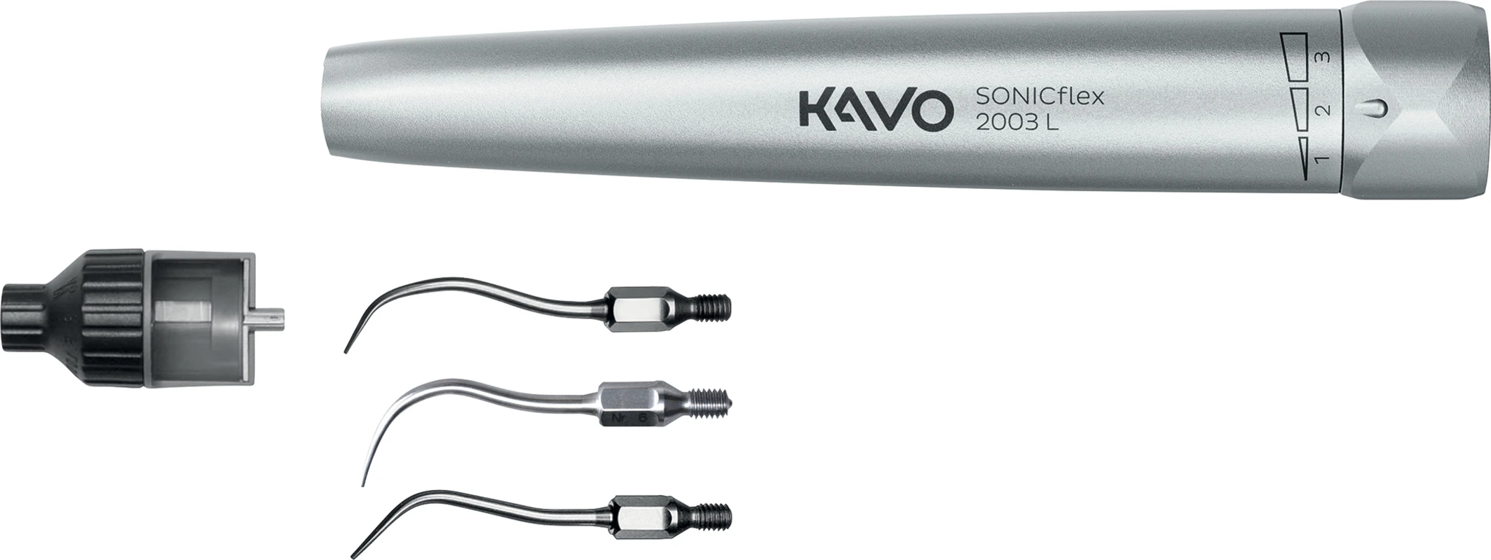 Der SONICflex™ 2003 L Airscaler ist mit über 50 Spitzenaufsätzen für Prophylaxe, Parodontologie, Inlay Präparation, minimalinvasive Behandlung, Endodontie, Endochirurgie und Chirurgie universell einsetzbar. Das Instrument wird einfach auf die MULTIflex™-Kupplung aufgesteckt und verfügt über drei Leistungsstufen für eine indikationsbezogene Anpassung. Zwei Glasstäbe (12.000 LUX) gewährleisten eine gute Ausleuchtung des Arbeitsfeldes. Die Plasmatec Oberfläche ist sehr beständig, verfügt über ideale Griffeigenschaften und erfüllt höchste Hygieneanforderungen.