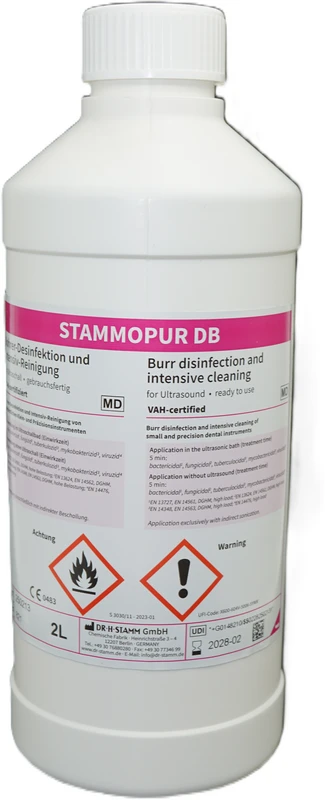 STAMMOPUR DB Bohrer-Desinfektion und Intensiv-Reinigung. Gebrauchsfertige Lösung zur manuellen Bohrer-Desinfektion und Intensiv-Reinigung im Ultraschallbad für zahnärztliche, rotierende und nicht-rotierende Klein- und Präzisionsinstrumente sowie endodontologische Kleininstrumente, z. B. Bohrer, Fräser, Diamantschleifer und Wurzelkanalinstrumente. Auch zur Desinfektion ohne Ultraschall im Fräsator (Tauchbadverfahren) einsetzbar. Der Einsatz des Präparates erfolgt im Prozess der Instrumentenaufbereitung in der Zahnarztpraxis und der Zahnklinik. Kann zur abschließenden Desinfektion eingesetzt werden. Auf einen Blick