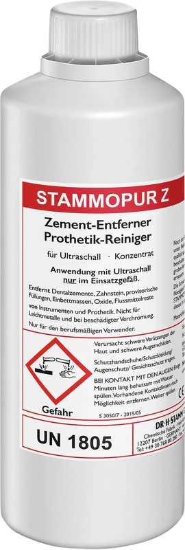 STAMMOPUR ZZement-Entferner und Prothesen-ReinigerKonzentrat zur Zement-Entfernung und Prothesen-Reinigung im dentalmedizinischen Bereich zur Anwendung im Ultraschallbad für den Einsatz an Instrumenten, Zubehör und Komponenten von Medizinprodukten, sowie an neuen und getragenen Zahnprothesen und Orthesen.Der Einsatz des Präparates erfolgt im Prozess der Instrumentenaufbereitung und Zahnprothesen-Reinigung in der Zahnarztpraxis, Zahnklinik, Kieferchirurgie, Kieferorthopädie und im Dentallabor.Auf einen Blick– Konzentrat– Entfernt Zemente, Zahnstein, Beläge, provisorische Füllungen, Oxide und Flussmittelreste– Nur im Einsatzgefäß anwenden– Frei von Essig- und Salzsäure– Biologisch abbaubarMaterialverträglichkeit und VerunreinigungenSTAMMOPUR Z besitzt eine hohe Materialverträglichkeit.Durch die Formulierung im stark sauren Bereich jedoch nicht geeignet für säureempfindlichen Materialien wie Leichtmetalle und beschädigter Verchromung.Entfernt– Zemente,– Zahnstein,– Beläge,– provisorische Füllungen,– Oxideund Flussmittelrestevon folgenden Materialien– Edelstahl,– Edelmetall,– Titan,– Glas,– Porzellan,– Keramikund Kunststoff.AnwendungDie ausschließlich beruflichen Anwender sind geschultes Fachpersonal.STAMMOPUR Z hat eine sehr hohe Reinigungswirkung, die jedoch erst im Zusammenhang mit der Ultraschalleinwirkung im Ultraschallbad wirksam wird.Die Anwendung erfolgt ausschließlich im Ultraschallbad im indirekten Verfahren in Einsatzgefäßen, wie z. B. Einhängewanne aus Kunststoff oder Becherglas.Dosierung und EinwirkzeitDosierung:im Ultraschallbad: 5%ohne Ultraschall: —Einwirkzeit:im Ultraschallbad: 3-10 minohne Ultraschall: —Temperatur: kalt ansetzen und nicht zusätzlich erwärmenZusammensetzung auf 100g:> 10 % Phosphorsäure,1-< 10 % nichtionische Tenside, 1-< 10 % kationische Tenside Produkt-pH-Bereich: stark sauer Die Anwendung erfolgt verdünnt mit Wasser mit mindestens Trinkwasserqualität. Eine Beimischung von Zusätzen in die Reinigungslösung ist nicht zulässig. Besondere Hinweise Säurebeständige Zemente werden nicht entfernt, wie z. B. Glas-Ionomer-Zemente. Optiken, Lichtleiter und geklebte Teile nicht mit Ultraschall behandeln. Bohrer und weitere rotierende Kleininstrumente nicht mit STAMMOPUR Z behandeln. Gefahrenhinweise H314 Verursacht schwere Verätzungen der Haut und schwere Augenschäden. Sicherheitshinweise P280 Schutzhandschuhe/Schutzkleidung/Augenschutz/Gesichtsschutz tragen. P305+P351+P338 BEI KONTAKT MIT DEN AUGEN: Einige Minuten lang behutsam mit Wasser ausspülen. Eventuell vorhandene Kontaktlinsen nach Möglichkeit entfernen. Weiter ausspülen. Inhalt Reinigungsmittel Produktvideos: