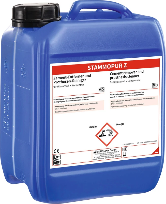 STAMMOPUR ZZement-Entferner und Prothesen-ReinigerKonzentrat zur Zement-Entfernung und Prothesen-Reinigung im dentalmedizinischen Bereich zur Anwendung im Ultraschallbad für den Einsatz an Instrumenten, Zubehör und Komponenten von Medizinprodukten, sowie an neuen und getragenen Zahnprothesen und Orthesen.Der Einsatz des Präparates erfolgt im Prozess der Instrumentenaufbereitung und Zahnprothesen-Reinigung in der Zahnarztpraxis, Zahnklinik, Kieferchirurgie, Kieferorthopädie und im Dentallabor.Auf einen Blick– Konzentrat– Entfernt Zemente, Zahnstein, Beläge, provisorische Füllungen, Oxide und Flussmittelreste– Nur im Einsatzgefäß anwenden– Frei von Essig- und Salzsäure– Biologisch abbaubarMaterialverträglichkeit und VerunreinigungenSTAMMOPUR Z besitzt eine hohe Materialverträglichkeit.Durch die Formulierung im stark sauren Bereich jedoch nicht geeignet für säureempfindlichen Materialien wie Leichtmetalle und beschädigter Verchromung.Entfernt– Zemente,– Zahnstein,– Beläge,– provisorische Füllungen,– Oxideund Flussmittelrestevon folgenden Materialien– Edelstahl,– Edelmetall,– Titan,– Glas,– Porzellan,– Keramikund Kunststoff.AnwendungDie ausschließlich beruflichen Anwender sind geschultes Fachpersonal.STAMMOPUR Z hat eine sehr hohe Reinigungswirkung, die jedoch erst im Zusammenhang mit der Ultraschalleinwirkung im Ultraschallbad wirksam wird.Die Anwendung erfolgt ausschließlich im Ultraschallbad im indirekten Verfahren in Einsatzgefäßen, wie z. B. Einhängewanne aus Kunststoff oder Becherglas.Dosierung und EinwirkzeitDosierung:im Ultraschallbad: 5%ohne Ultraschall: —Einwirkzeit:im Ultraschallbad: 3-10 minohne Ultraschall: —Temperatur: kalt ansetzen und nicht zusätzlich erwärmenZusammensetzung auf 100g:> 10 % Phosphorsäure,1-< 10 % nichtionische Tenside, 1-< 10 % kationische Tenside Produkt-pH-Bereich: stark sauer Die Anwendung erfolgt verdünnt mit Wasser mit mindestens Trinkwasserqualität. Eine Beimischung von Zusätzen in die Reinigungslösung ist nicht zulässig. Besondere Hinweise Säurebeständige Zemente werden nicht entfernt, wie z. B. Glas-Ionomer-Zemente. Optiken, Lichtleiter und geklebte Teile nicht mit Ultraschall behandeln. Bohrer und weitere rotierende Kleininstrumente nicht mit STAMMOPUR Z behandeln. Gefahrenhinweise H314 Verursacht schwere Verätzungen der Haut und schwere Augenschäden. Sicherheitshinweise P280 Schutzhandschuhe/Schutzkleidung/Augenschutz/Gesichtsschutz tragen. P305+P351+P338 BEI KONTAKT MIT DEN AUGEN: Einige Minuten lang behutsam mit Wasser ausspülen. Eventuell vorhandene Kontaktlinsen nach Möglichkeit entfernen. Weiter ausspülen. Inhalt Reinigungsmittel Produktvideos: