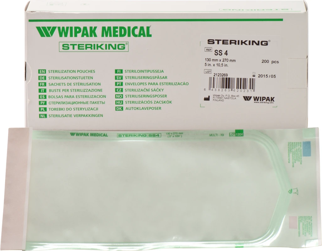 Sterilgutverpackung für die Dampf- und Gassterilisation. Kein Schweißgerät erforderlich. Medizinisches Spezialpapier. 9-schichtige Kunststoff-Folie für höchste Reißfestigkeit. Kontrollindikatoren für Dampf- und Gassterilisation aufgedruckt.