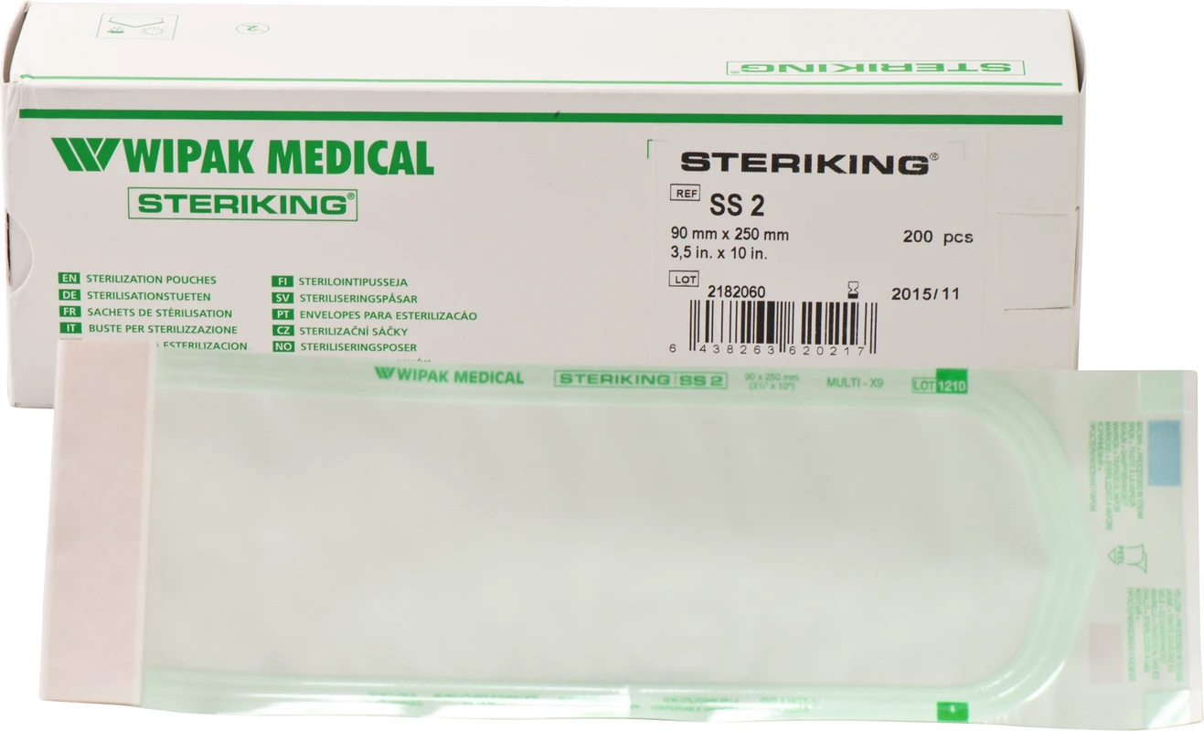 Sterilgutverpackung für die Dampf- und Gassterilisation. Kein Schweißgerät erforderlich. Medizinisches Spezialpapier. 9-schichtige Kunststoff-Folie für höchste Reißfestigkeit. Kontrollindikatoren für Dampf- und Gassterilisation aufgedruckt.