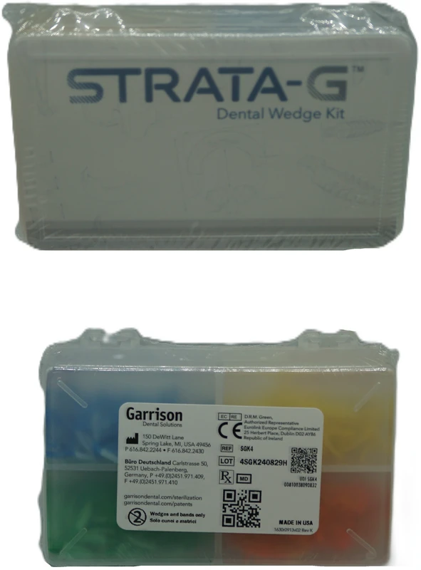 Das neue Strata-G™ Teilmatrizensystem von Garrison Dental Solutions. Jetzt noch schneller und zuverlässiger perfekte Klasse II Kavitäten füllen! Kombinieren Sie die Strata-G™ Ringe, Bänder und Keile für eine 270º Abdichtung und eine ultimative Überschussreduzierung bei allen Klasse II Kavitäten. Die Ringe springen dank der Retentionsspitzen nicht vom Zahn und der grüne Ring für weite Kavitäten vereinfacht schwierige breite Präparationen. Verbesserungen: Langlebigere Ringe dank verbessertem Material – Ringmetall jetzt aus gezogenem Nickel-Titan Draht Weniger Überschuss dank verbesserter Form der Ringfüßchen und Bänder Ringe haben starke Separationskraft – dennoch sind sie einfacher zu öffnen Inhalt 3 Ringe50 Matrizenbänder40 Keile1 Ringseparierzange