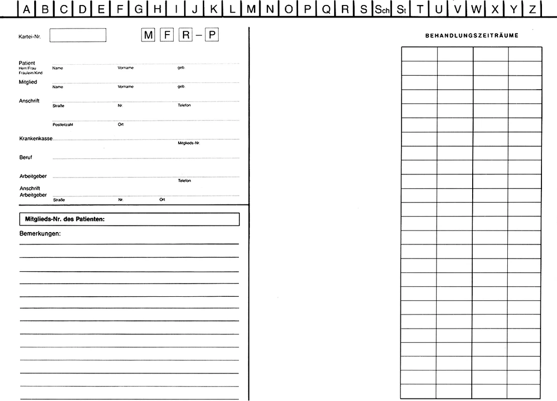 Spitta-System-Karteikarte – der Klassiker in DIN A5Patientendaten und Patientendokumentationen sind das höchste Gut einer jeden Zahnarztpraxis. Gerade aus diesem Grund sollten die Voraussetzungen für den perfekten Umgang mit den sensiblen Patientendaten zu jeder Zeit gegeben sein.Mit der Spitta-System-Karteikarte (DIN A5) haben Sie alle relevanten Daten und Informationen über Ihren Patienten gesammelt zur Hand.Zur optimalen Dokumentation Ihrer Patientendaten bietet Ihnen die Karteikarte folgende Nutzungsmöglichkeiten: Alphabetleiste: Die Buchstaben der Alphabetleiste – systematisch mit Farben markiert – bieten Ihnen eine optimale Übersicht und verhindern das falsche Einsortieren in Ihrem Karteikartensystem. Heftmechanik: Separat eingeklebt in die Karteikarte sorgt die stabile Heftmechanik für eine längere Haltbarkeit Ihrer Karteikarte. Behandlungszeiträume: Auch bei geschlossener Karteikarte sehen Sie auf einen Blick, wann der Patient zuletzt behandelt wurde. Anschriftenfeld: Die Patientenstammdaten lassen sich ganz bequem mit einem Aufkleber platzieren. Zahnschema: Die Erstbefund- bzw. 01-Befundaufnahme für das Erwachsenen- und Milchzahngebiss ist zur sofortigen Beschriftung gleich auf die Karteikarte aufgedruckt. Signalreiter: Platzieren Sie bis zu 6 Signalreiter für Überwachungen und Kontrollen in Ihrer Karteikarte. Kontoführung: Behalten Sie jederzeit die Übersicht – mit der einfachen Auflistung des Patientenkontos auf der Rückseite. Optimale Dokumentation durch bewährte Karteiaufteilung Alle Patientenunterlagen und Röntgenbilder in einer Kartei sicher archivieren Leichtes Sortieren von Karteikarten durch Farbmarkierung und Reiterplatzierung Einheitliches Erscheinungsbild der Karteikarte Format: DIN A5 Maße: 21 x 14,8 cm Sonstige Infos: vorgedrucktes Anschriftenfeld Inhalt Karteikarten