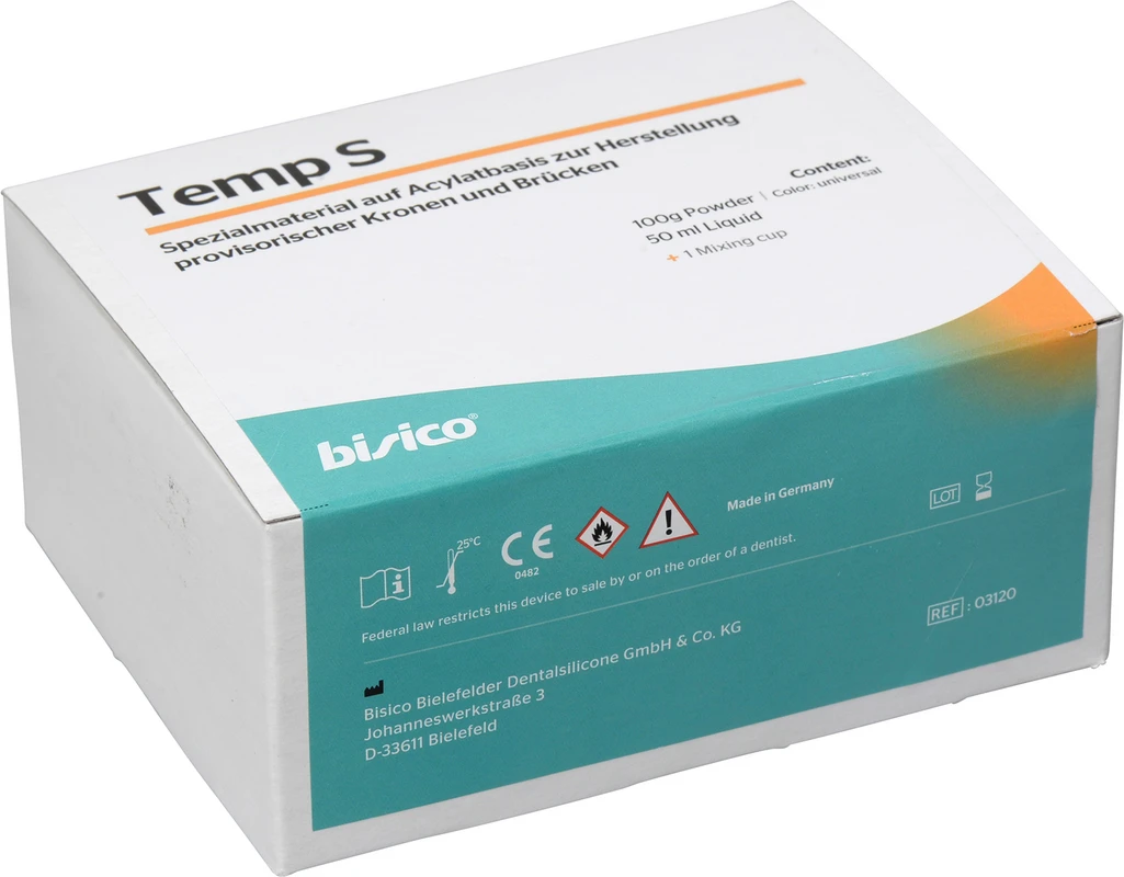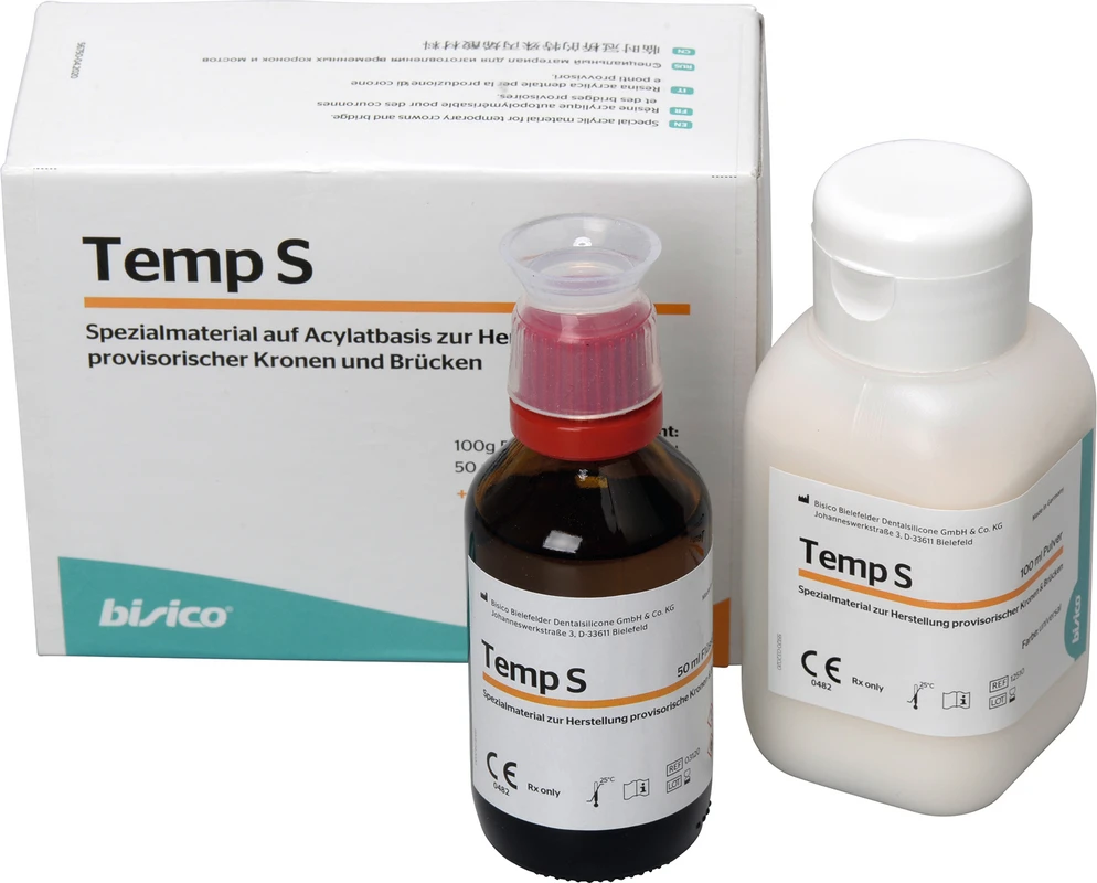 Provisorisches Kronen- und Brückenmaterial. Bisico® Temp S ist ein seit Jahrzehnten bewährtes Material auf Acrylatbasis zur Herstellung provisorischer Kronen und Brücken. Die Anwendung erfolgt durch manuelles Mischen von Pulver und Flüssigkeit und kann intraoral, aber auch extraoral erfolgen. Durch anteiliges Zufügen des Pulvers „hell“ zur Farbe „universal“, kann das Provisorium im Farbton individuell angepasst werden. Das Material ist bruch- und abriebfest und lässt sich besonders gut ausarbeiten, polieren und reparieren.