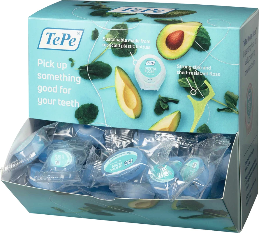Das TePe® Dental Floss ist eine sich ausdehnende Zahnseide, die Plaque effizient und sanft zwischen den Zähnen entfernt. Die Zahnseide ist mit einer Beschichtung aus pflanzlichem Wachs und Avocadoöl versehen und gleitet leicht zwischen den Zähnen, ohne zu zerfasern. Sie wird aus recycelten Wasserflaschen hergestellt, um die Umwelt zu schonen. Um Zähne und Zahnfleisch gesund zu erhalten, wird eine tägliche Anwendung empfohlen.