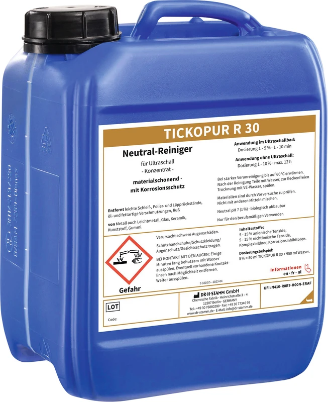 Zur besonders schonenden Reinigung und Entfettung von zerlegten und unzerlegten Maschinen, Werkzeug-, Glas- und Keramikteilen in Industrie, Handwerk und Laboratorien. TICKOPUR R 30 ist speziell für die Reinigung in SONOREX-Ultraschallgeräten, aber auch zur Tauch-, Wisch und Hochdruckreinigung einzusetzen. Bei sachgemäßer Anwendung wird eine schnelle und materialschonende Reinigung gewährleistet.