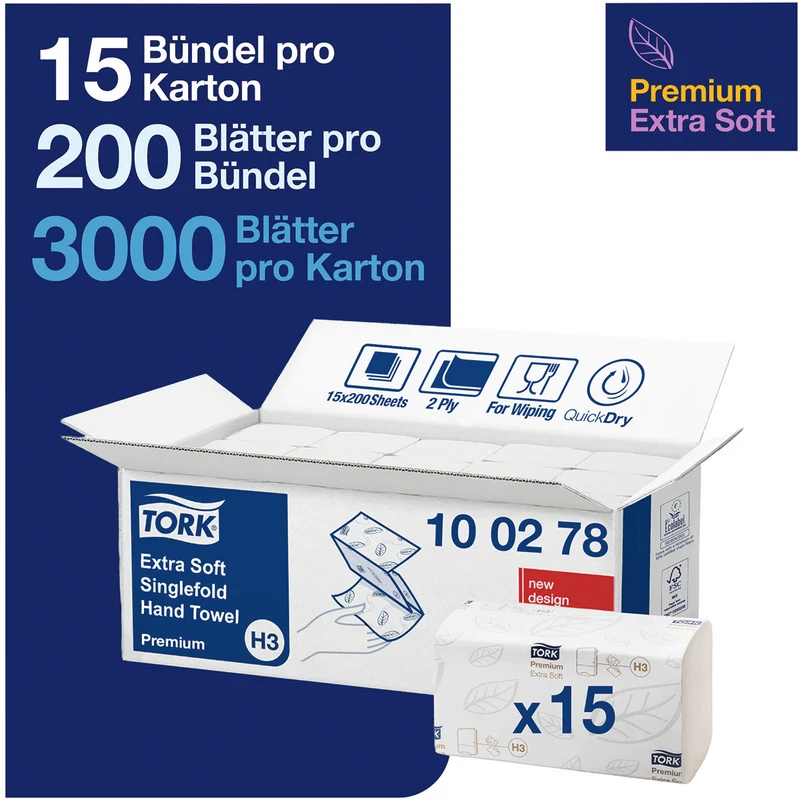 Premium-Qualität für hygienische Händetrocknung: Die TORK® extra weichen Zickzack Handtücher (V-Falz) im H3 System vereinen komfortable Anwendung mit hoher Wirtschaftlichkeit. Das 2-lagige Papier bietet maximale Saugkraft bei gleichzeitig reduziertem Verbrauch.
