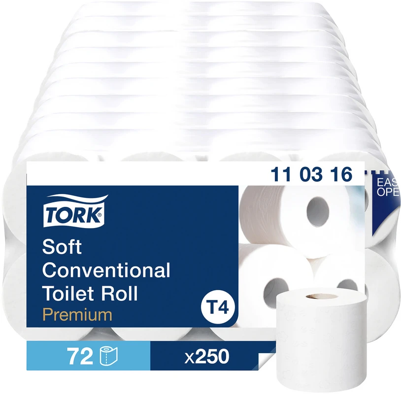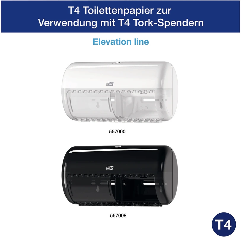- Effiziente Nutzung: Kompatibel mit den TORK® T4 Toilettenpapierspendern, die Platz für zwei Kleinrollen bieten, wodurch Zeit beim Nachfüllen gespart wird.