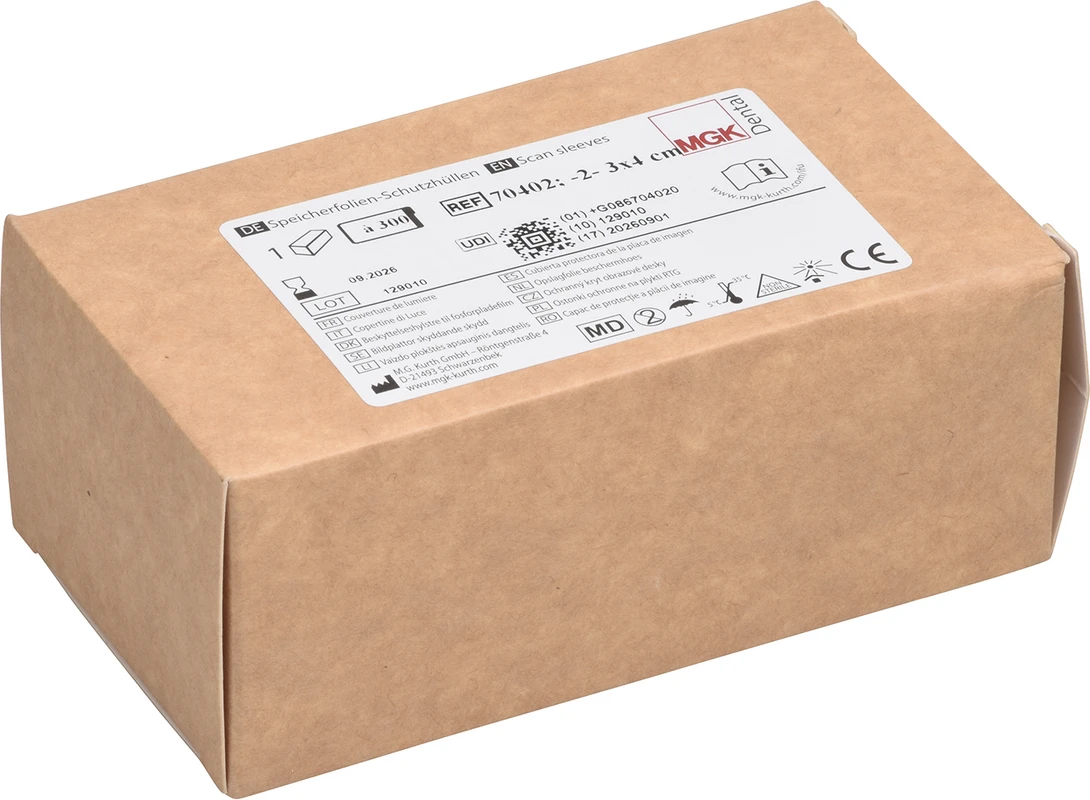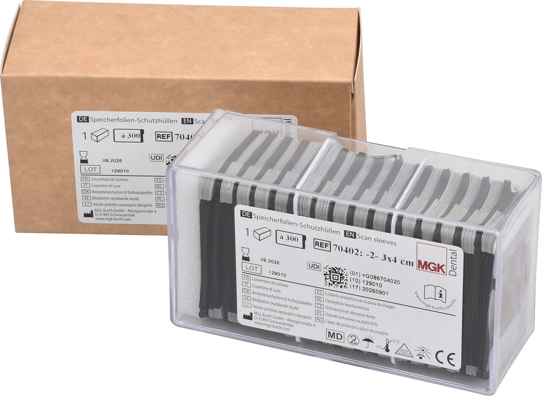 Die Speicherfolien-Schutzhüllen sind einmal verwendbare Kunststoffhüllen zum Schutz des Patienten vor Partikelkontaminationen durch die Speicherfolie, zur Vermeidung von Kreuzkontaminationen unter Patienten und zum Schutz (Licht, Staub, Schmutz, physikalische Beschädigung) der intraoralen Speicherfolien bei digitalen Dental-Röntgenaufnahmen. Die Schutzhüllen sind in 5 Größen (0, 1, 2, 3, 4) erhältlich und kompatibel mit den gängigen Speicherfoliengrößen auf dem Markt.