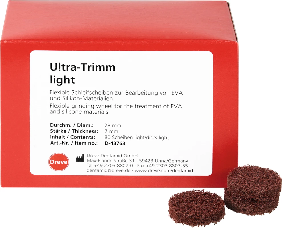 Flexible Schleifscheiben für das grobe bis feine Bearbeiten von EVA-Tiefziehplatten für Sportmundschutz (z. B. Drufosoft®), weichbleibendem Unterfütterungssilikon (z. B. MegaBase®), Positioner-Silikon (z. B. Odontosil), sowie für harte und hart/weiche Tiefziehfolien bei maximal 15.000 Umdrehungen / Minute. Inhalt Scheiben Produktvideos: