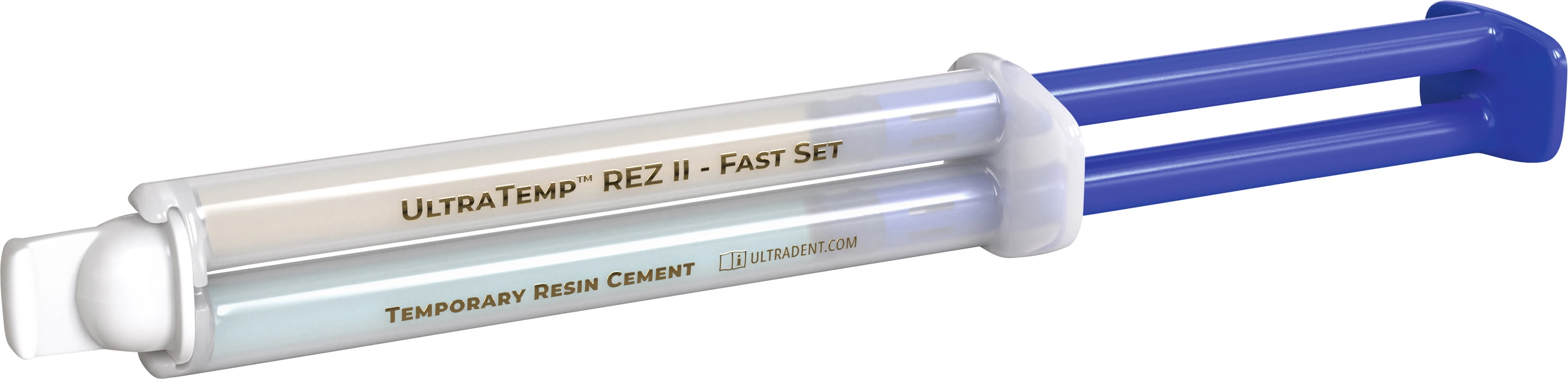 UltraTemp™ REZ II ist ein hydrophiler, kunststoffbasierter und röntgensichtbarer provisorischer Befestigungszement speziell für längere Retention (2 – 4 Wochen). Erhältlich ist er in einer Doppelkammerspritze mit Mixing Tips in zwei Ausführungen: Fast Set (1 bis 2 Minuten Abbinde-zeit) und Regular Set (2 bis 3 Minuten Abbindezeit). Die wichtigsten Eigenschaften und Vorteile: