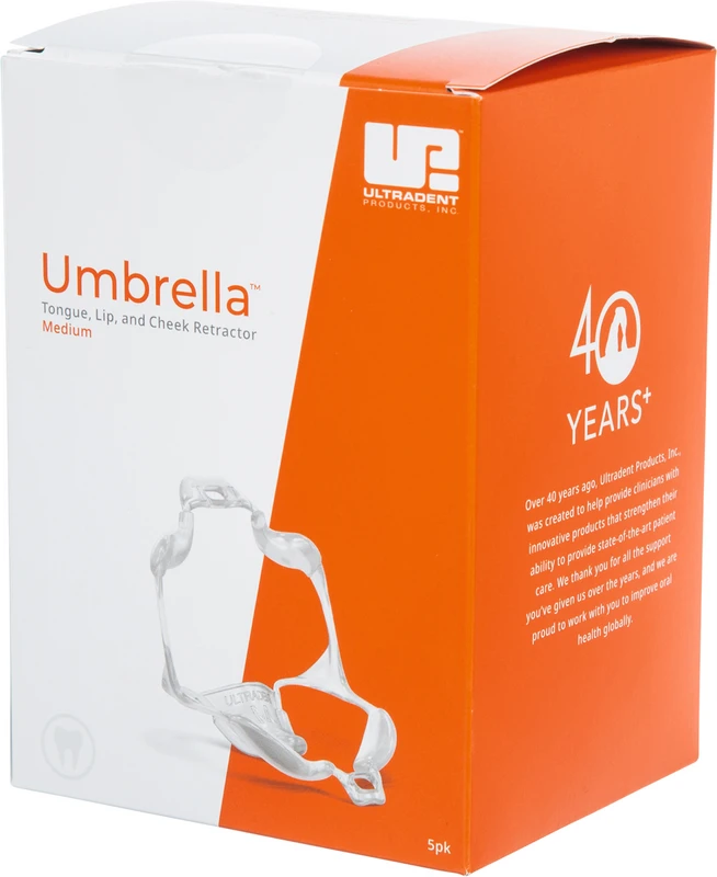 KOMFORTABEL: OPTIMALER ZUGANG UND PRAKTISCHE ISOLATIONDer Umbrella™ Zungen-, Lippen- und Wangenhalter weit mehr als die bloße Retraktion von Weichgewebe.Federunterstützung für eine sanfte, natürliche Öffnung des Mundes ganz ohne Ziehen oder Dehnen der Lippen und Wangen – besonders für Angstpatienten ein unschlagbarer VorteilInnovatives Zungenhalterkonzept: hält die Zunge bequem und zuverlässig zurückSpeichelkanalisierung außerhalb des Zahnbogens: verbesserter Zugang für AbsauginstrumenteKein Verursachen von Würgereizen bei den meisten PatientenAnatomisch geformte Halter: Handablage ohne Beeinträchtigung des PatientenkomfortsEinfache Positionierung im MundBleibt auch bei einer Bisskontrolle zuverlässig in-sit (alternative Anwendung mit Aufbissblock)Hygienisches EinwegproduktFür zahlreiche Indikationen geeignet Inhalt 40 Halter