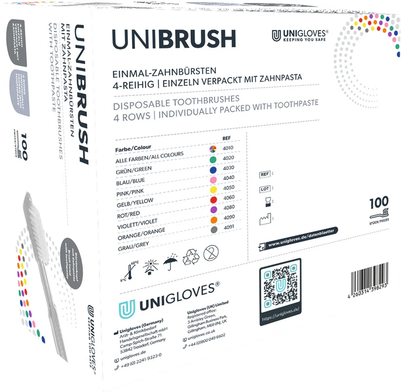 Die UNIBRUSH Einmalzahnbürsten sind sofort einsatzbereit und bieten eine einfache Lösung für die schnelle Zahnpflege zwischendurch. Ideal zur Patientenmitgabe, in der Prophylaxe oder für den Gebrauch in Kliniken oder Pflegeeinrichtungen.
