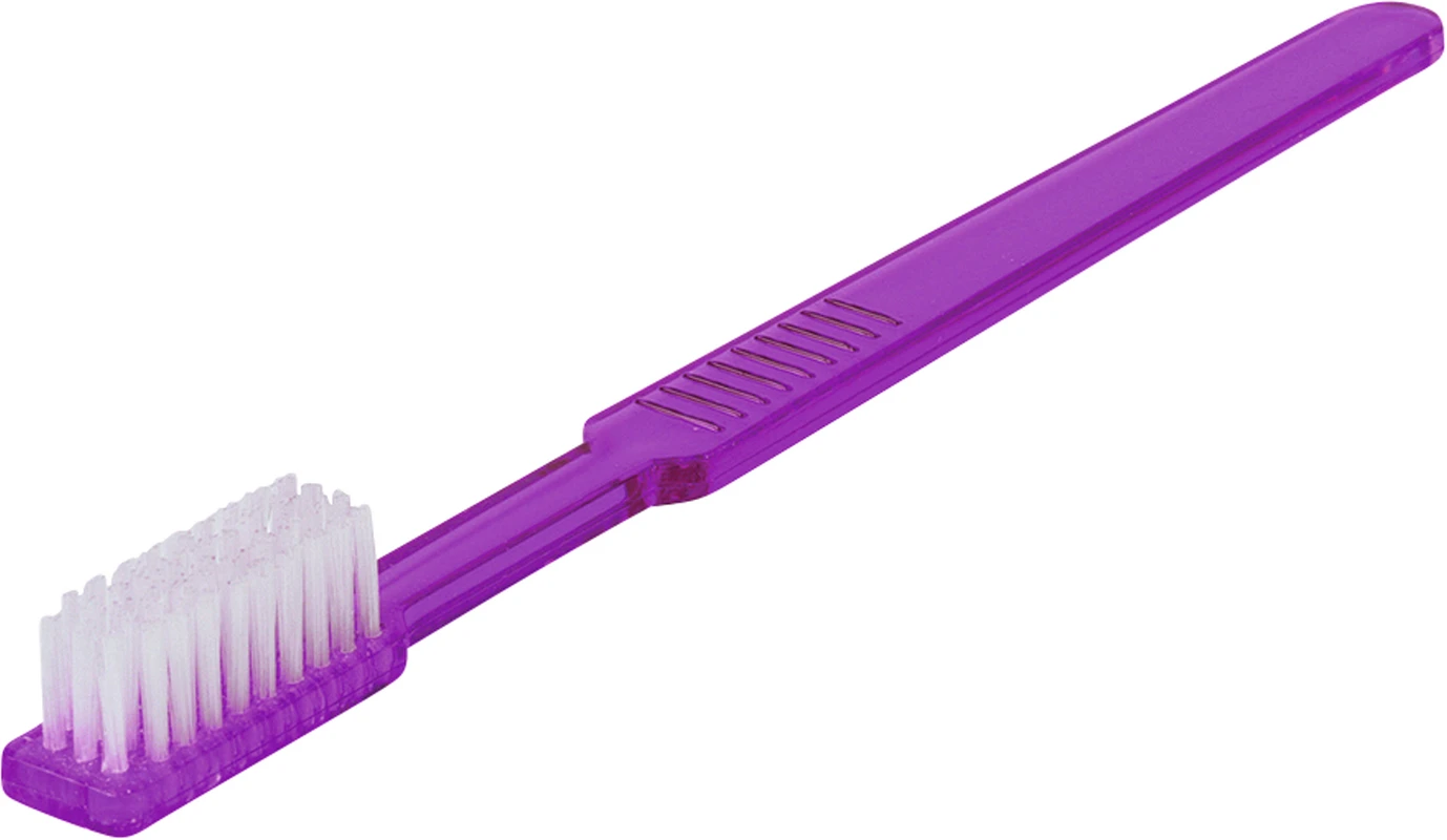 Inhalt: 100 Einmalzahnbürsten, 4-reihig, violett, mit Zahnpasta imprägniert