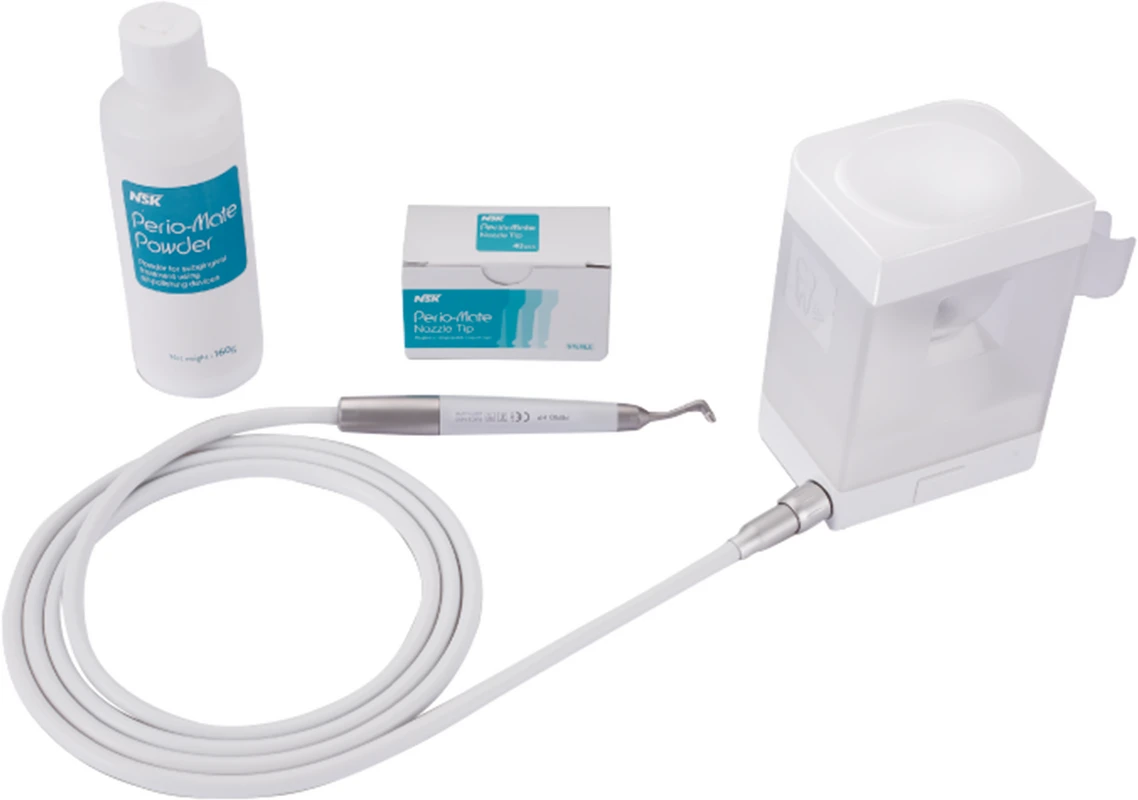 Die Pulverstrahlfunktion basiert auf den umfassenden Erfahrungen, die NSK auch in diesem Bereich über Jahrzehnte gesammelt hat. Ein höchst ergonomisches Handstück mit extrem schlanker Spitze vermittelt eine hervorragende Beweglichkeit und rückt damit auch hintere Molaren in erreichbare Nähe. Durch den gleichmäßigen und in seiner Intensität exakt regulierbaren Pulverstrahl wird eine höchst effiziente und zeitsparende Pulverstrahlbehandlung ermöglicht. In seiner Grundausstattung beinhaltet Varios Combi Pro die Pulverstrahleinheit für die supragingivale Anwendung in Verbindung mit den NSK FLASHpearl (Kalzium) oder dem NSK Reinigungspulver (Natrium-Bikarbonat).