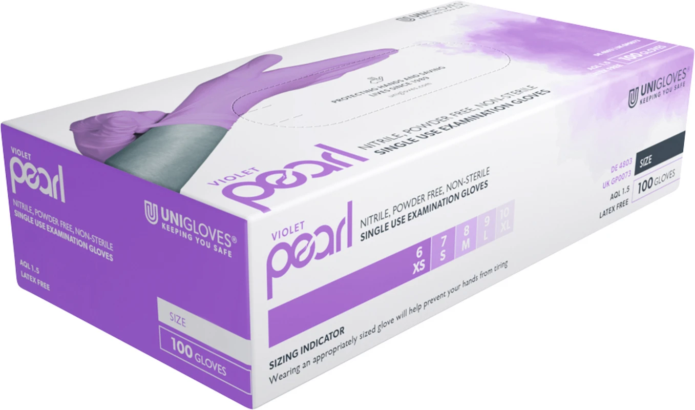 Sicher, hochwertig, komfortabel: Die VIOLET PEARL Nitrilhandschuhe aus der UNIGLOVES® PEARL LINE kombinieren hochwertige Qualität mit brillanten Farben und exzellenter Passform. Ideal für den Arbeitsalltag in der Praxis oder im Labor.