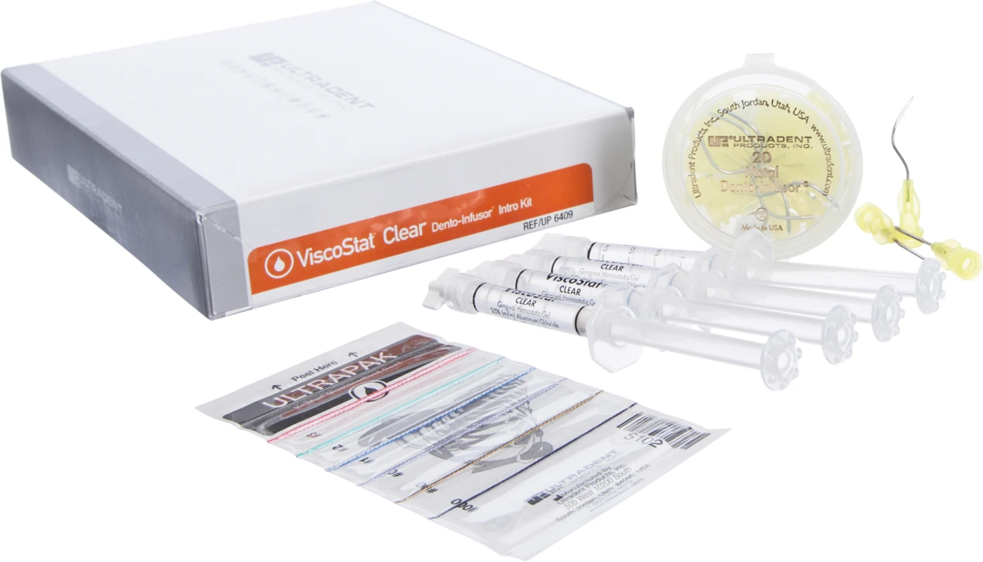 ViscoStat™ Clear ist ein viskoses, 25 %iges Aluminiumchlorid-Gel. Wirkt retrahierend und adstringierend, wirksam bei geringgradigen Blutungen. Verschluss von Kapillar-Enden durch eine Schwellung des Kollagens. Vorteil im sichtbaren Bereich: Es entstehen keine Blutkoagel und es gibt keine Verfärbungen von Hart- und Weichgeweben. Mit ViscoStat™ Clear wird empfohlen, den Sulcus auszureiben bzw. Ultrapak™-Fäden damit zu tränken. ist ein hämostatisches Gel mit 25 % Aluminiumchlorid in einer viskösen, wässrigen Lösung. Seine gewebefreundliche Formulierung mit Kieselsäure beseitigt temporär kleinere Blutungen. Es wird kein Koagulum gebildet, und es haften keine Reste an der Präparation, was in der „ästhetischen Zone“ besonders wichtig ist. ViscoStat™ Clear verfärbt die Hart-oder Weichgewebe nicht.
